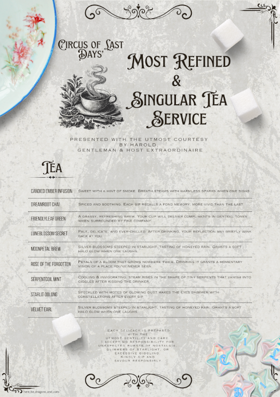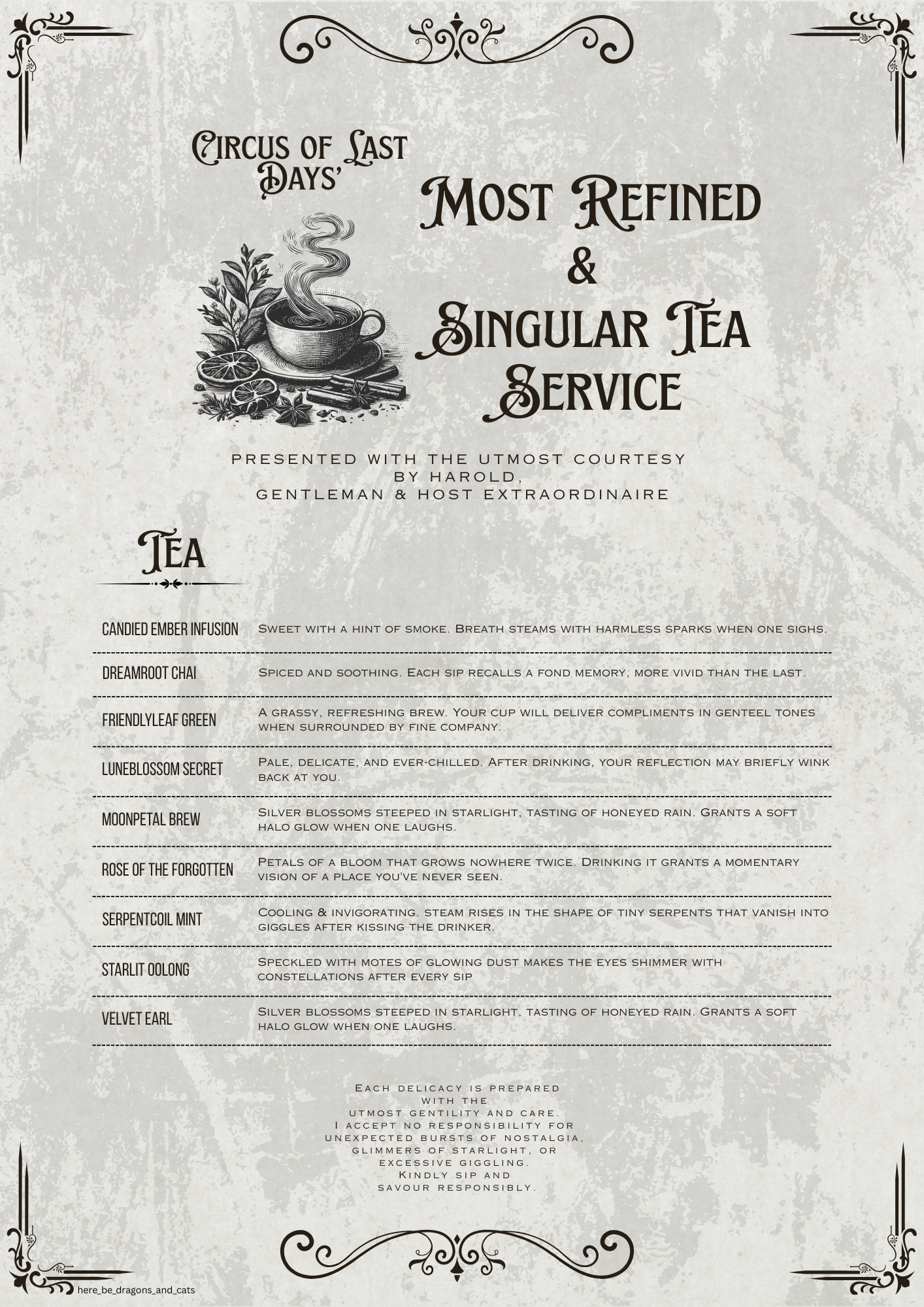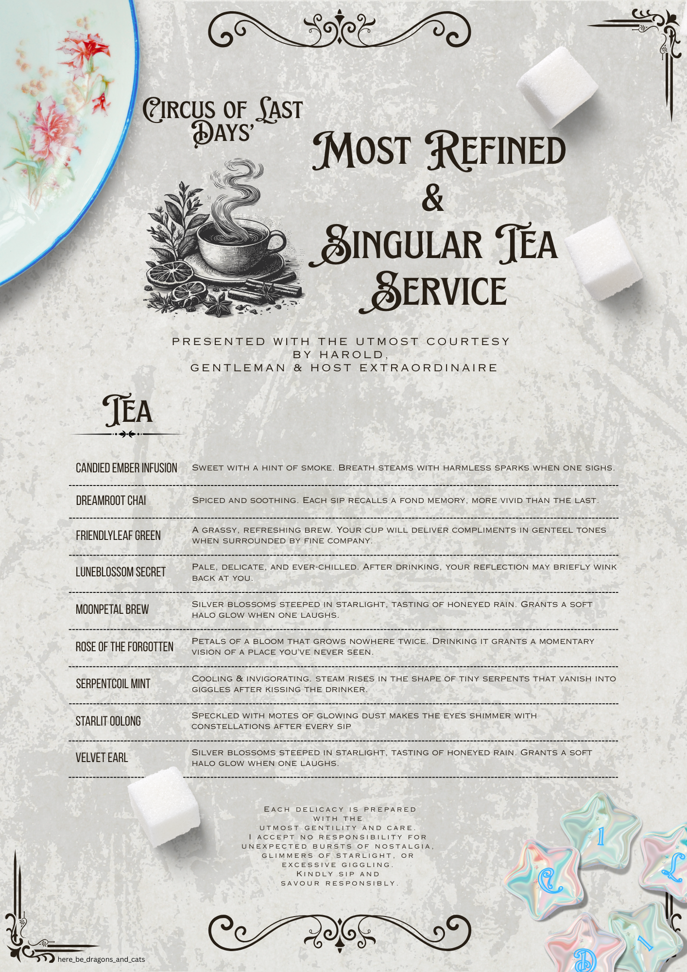 The Circus of Last Day's Most Refined & Singular Tea Service, Presented with the utmost courtesy by Harold, Gentleman & Host Extraordinaire.